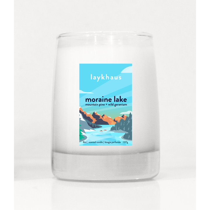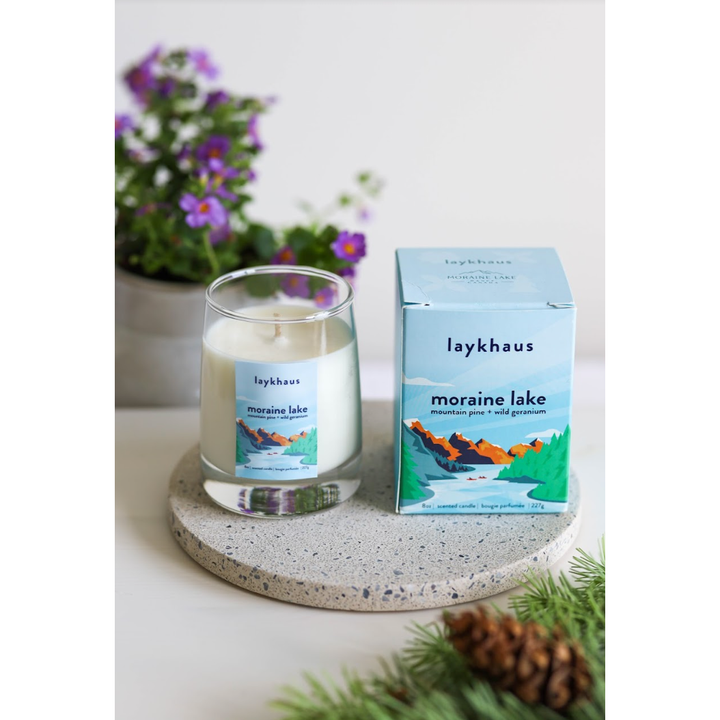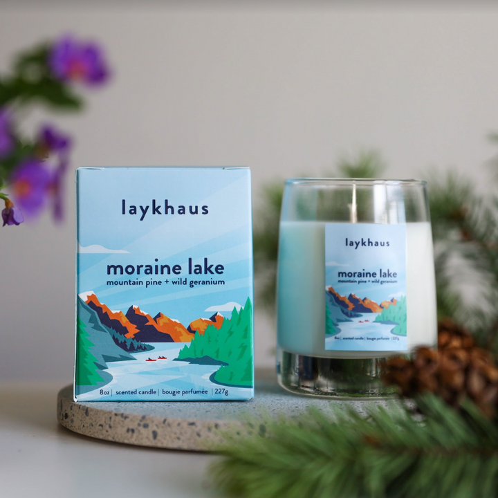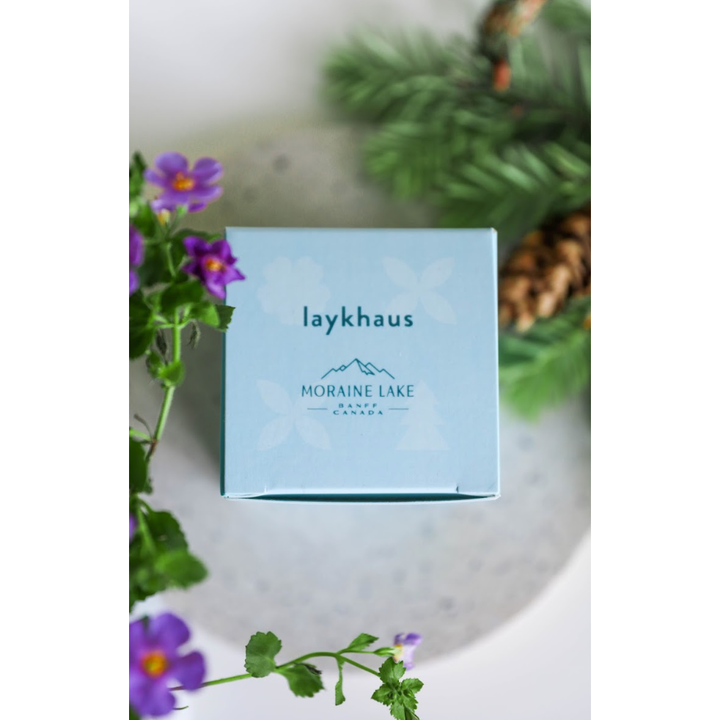 Discover the outdoor fragrance of mountain pine and fresh floral scents of wild geranium. Our signature votive candle comes in a custom box featuring original artwork of Moraine lake by Laykhaus. Laykhaus + Moraine Lake Lodge have worked to create a candle which captures the essence of Moraine lake in summer.
